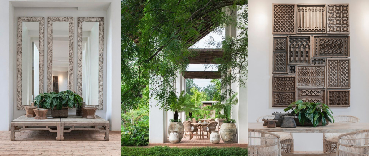 Hand-carved teak-frame mirrors, locally-crafted ceramic tiles, handwoven, hand-dyed