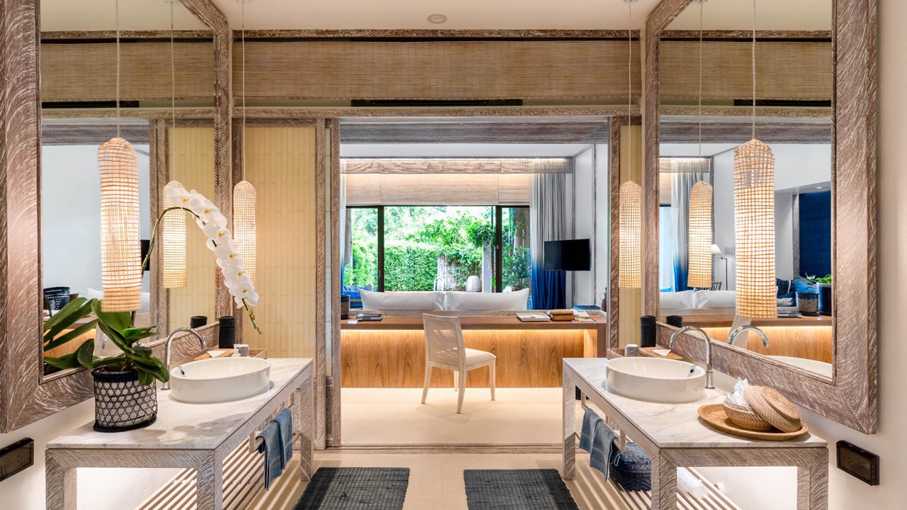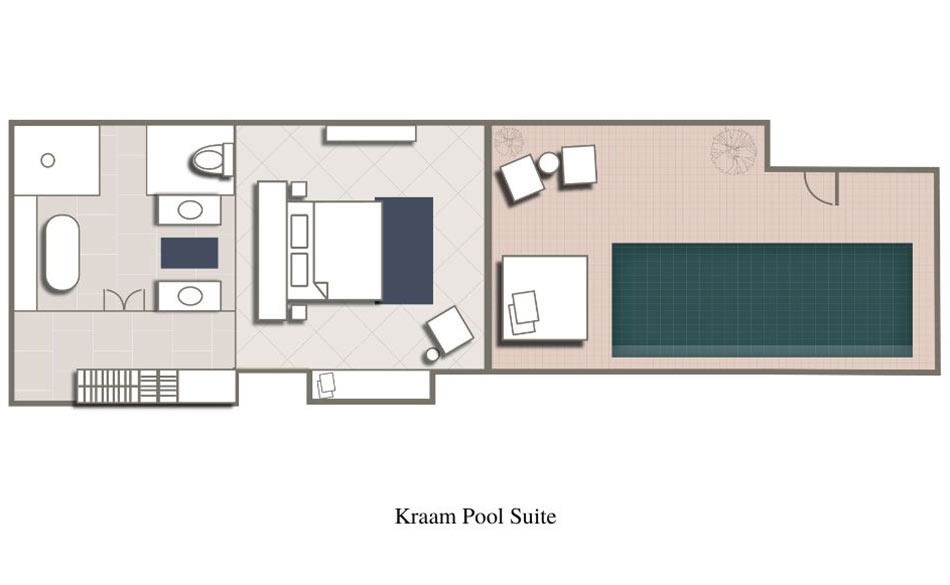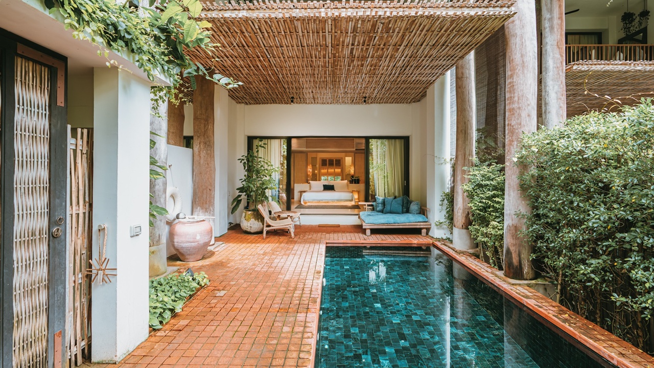 套房位于酒店绿意盎然的庭院中,距风光旖旎的河畔咫尺之遥。宽敞的户外平台,配有长七米宽三米的私人泳池,为宾客打造舒适的室内外居住空间。客房以简洁明亮的白色及乳白色为基调,靛蓝色的手工织物缀饰其间,凭添一番风趣。