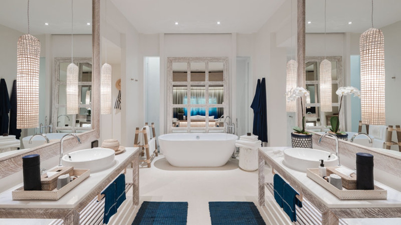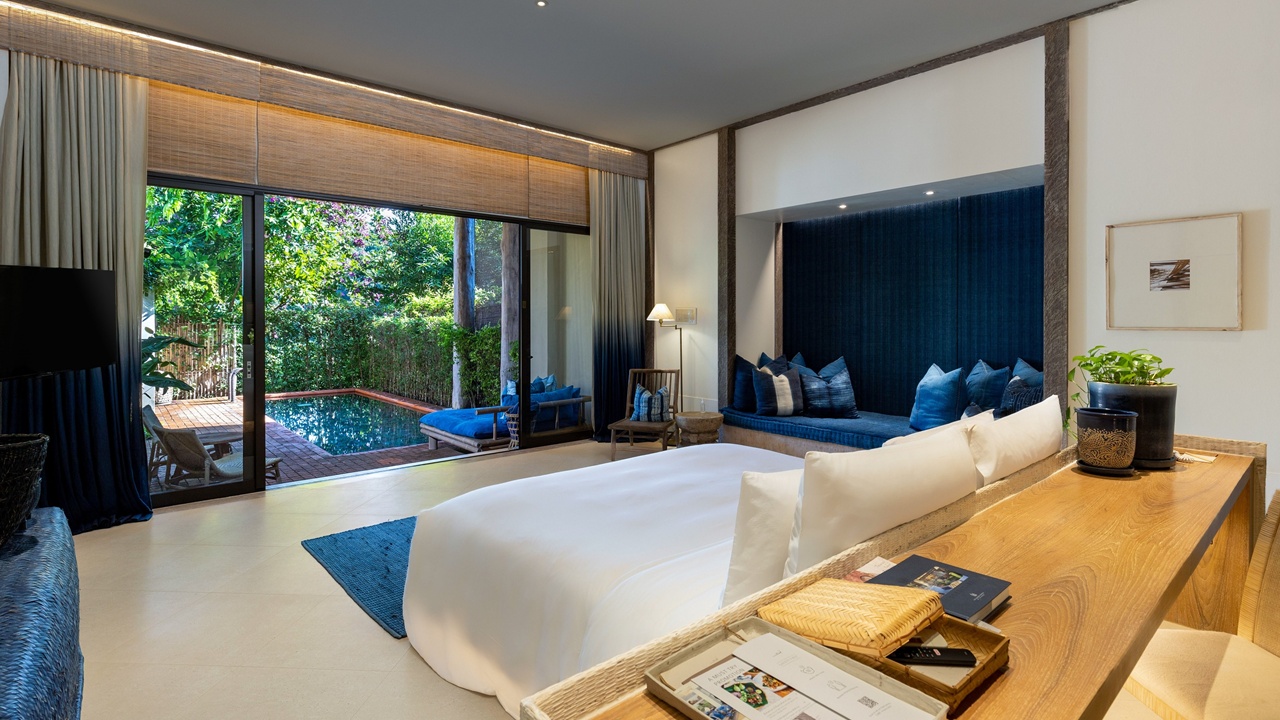 套房位于酒店绿意盎然的庭院中,距风光旖旎的河畔咫尺之遥。宽敞的户外平台,配有长七米宽三米的私人泳池,为宾客打造舒适的室内外居住空间。客房以简洁明亮的白色及乳白色为基调,靛蓝色的手工织物缀饰其间,凭添一番风趣。
